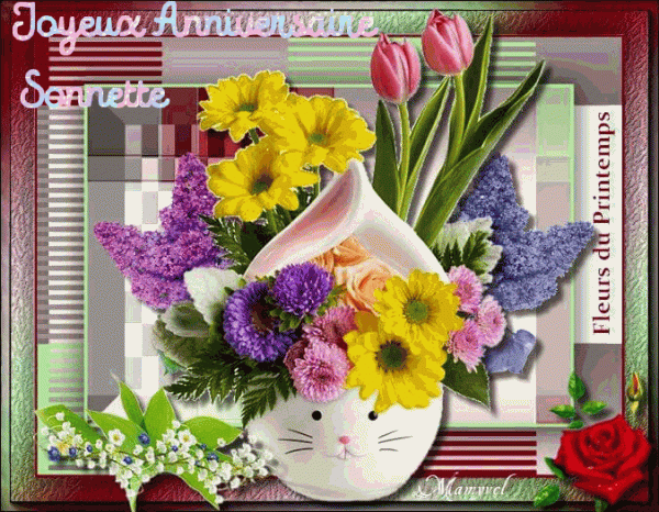 Bonjour sonnette. Merci pour tes coms et sincèrement désoler de ne pas avoir fait une créa pour marquer le coup alors avec bien du retard je te souhaites un joyeux anniversaire. Merci pour ton message pour le 1er mai mais le coeur n'y ait toujours pas comme avant mais je me dis qu'il y a pire que ça avec une pensée pour ton mari qui est malade, je souhaites de tout mon coeur qu'il guérisse très vite. Tu as reçue bien des cadeaux mais des messages très touchant pas tes amies(s) pour ton anniversaire qu'elle belle complicité pour te soutenir, c'est formidable cette belle amitié entre blogueurs et blogueuses!!!. Je te souhaites un bon après midi et un bon début de semaine. Bisous, ton amie giselehttp://yvonette56600.centerblog.net